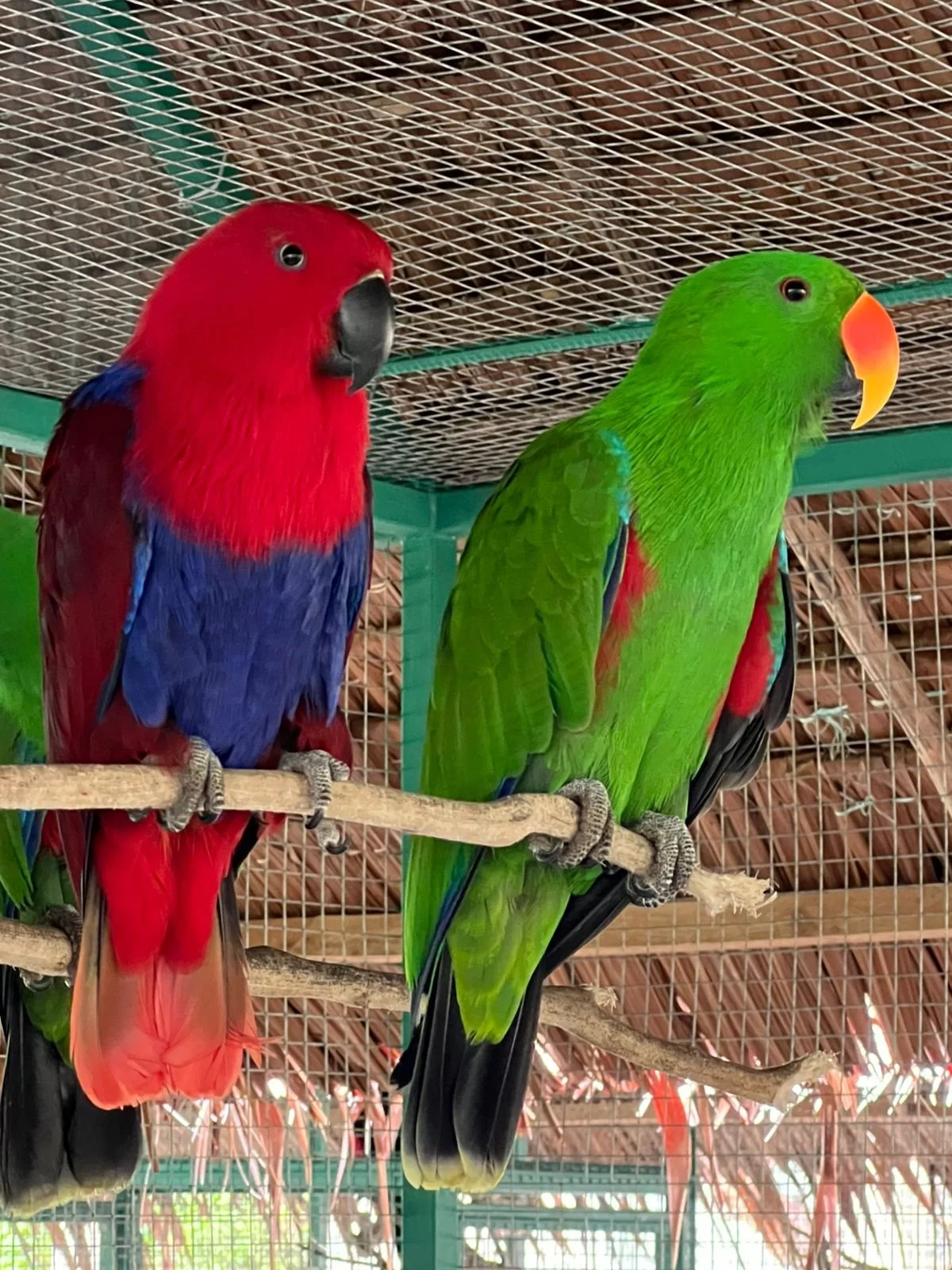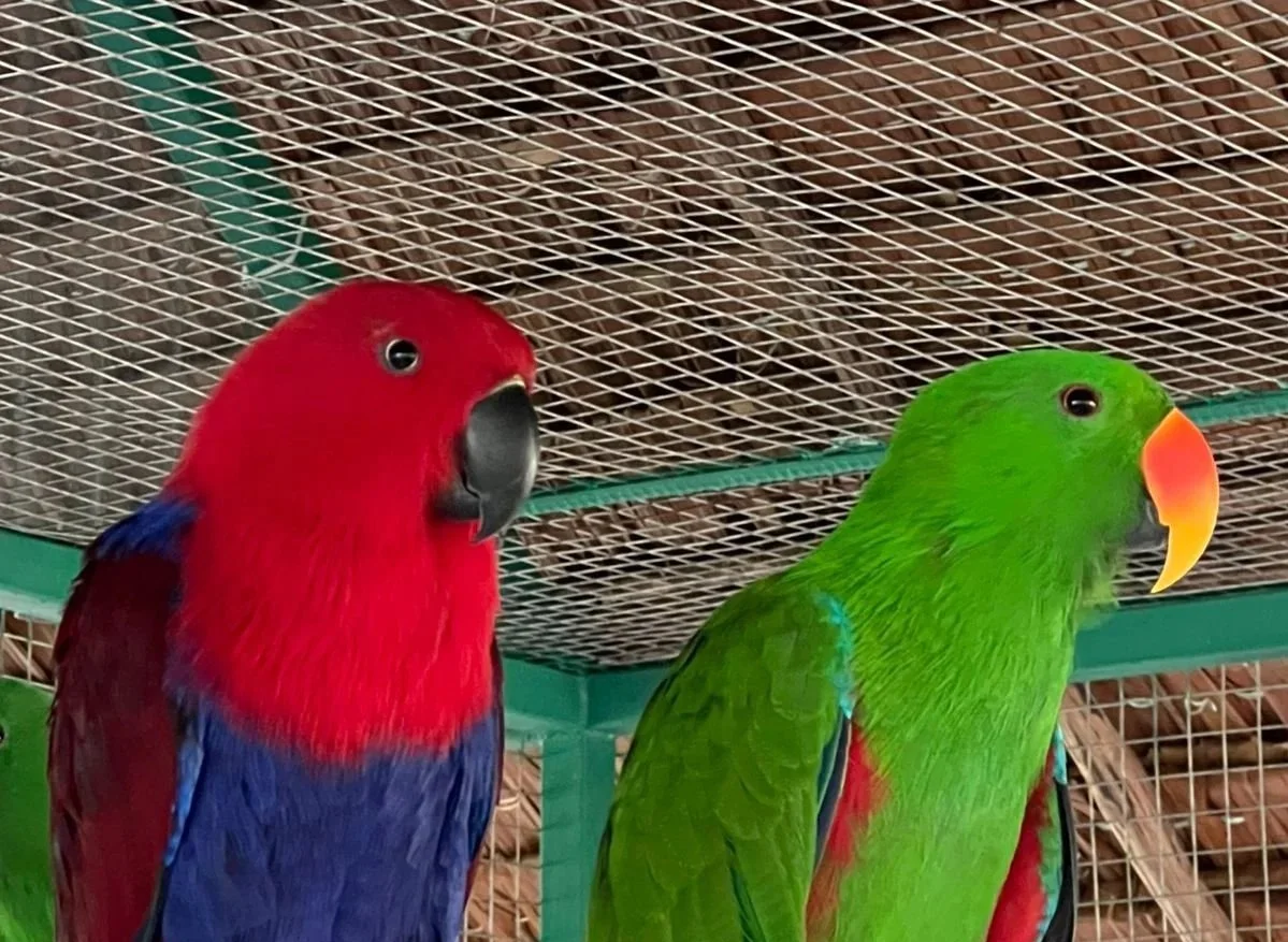 The Nuri Bayan is famous for its extreme color difference between males and females. Males are bright green with orange beaks, while females are deep red with purple-blue chests and black beaks. They are medium-sized parrots with long tails and smooth, glossy feathers.
